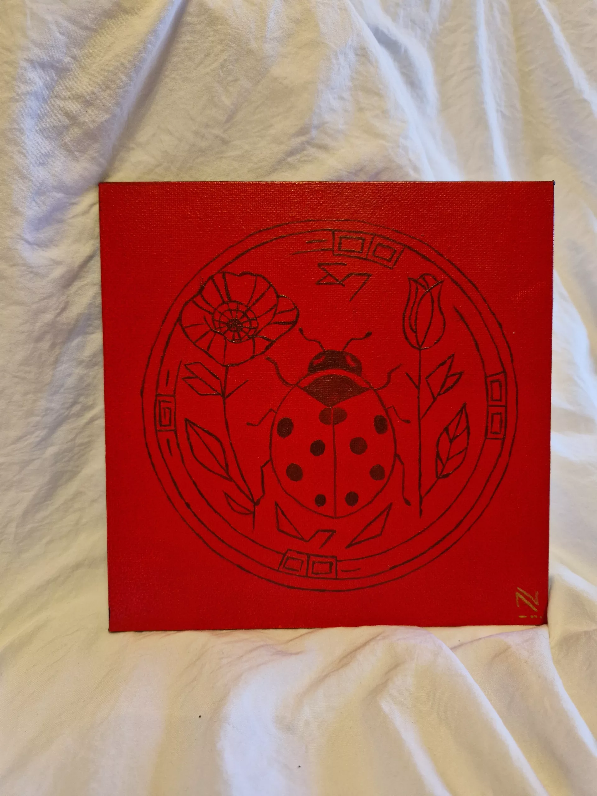 Un souffle de douceur traverse cette toile. La coccinelle, messagère de chance et de consécration, se pose au cœur du cercle, symbole d’unité, de cycle et d’harmonie. Le rouge vibrant et le coquelicot fragile évoquent vitalité, joie et beauté éphémère, rappelant la légèreté et la magie du vivant.