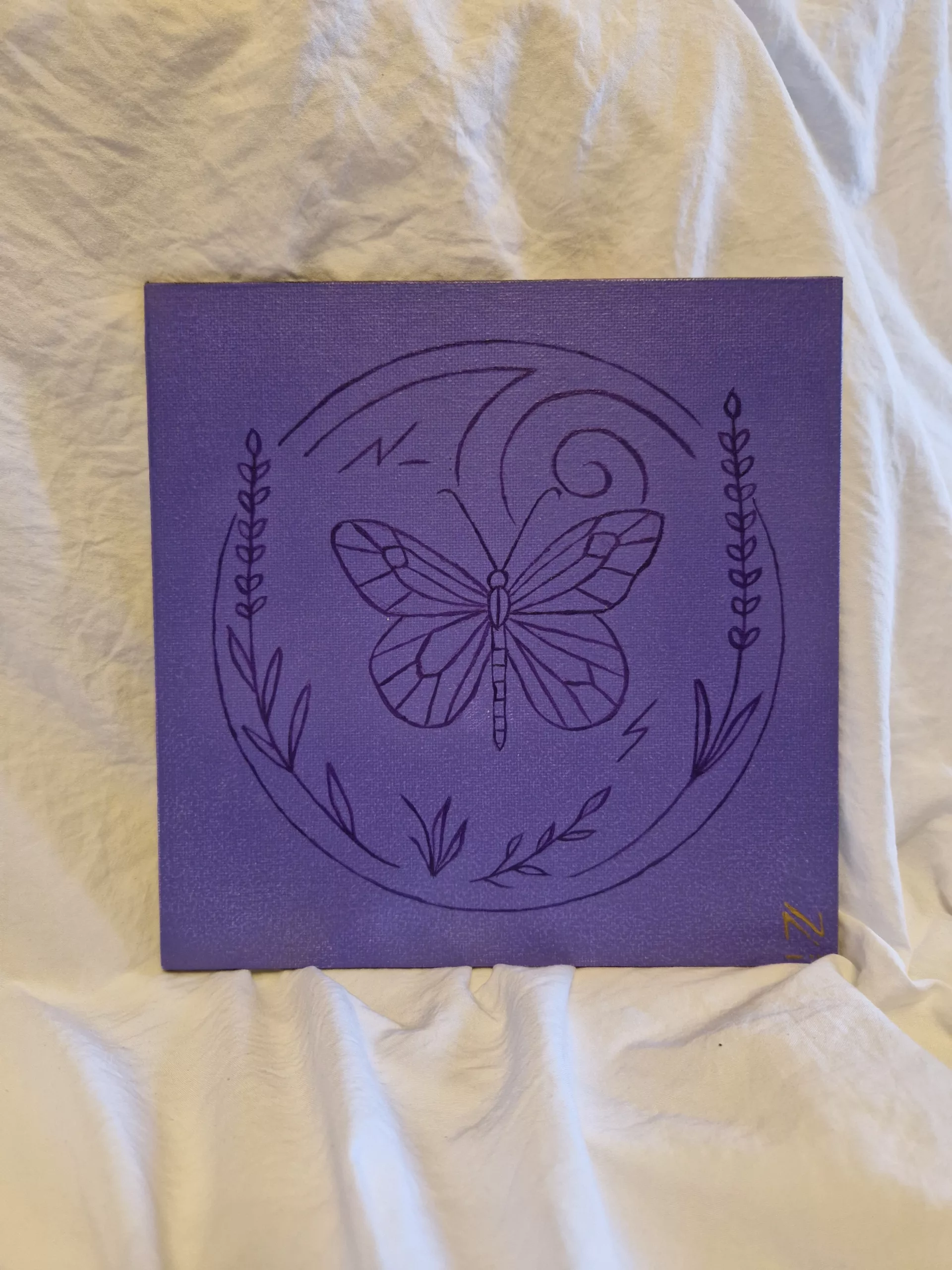 Un voyage vers l’harmonie intérieure se déploie avec délicatesse. Le papillon, messager de métamorphose, s’élance au cœur de la spirale, symbole de croissance. Le violet mystique et la lavande apaisante invitent au rêve et à la sérénité.